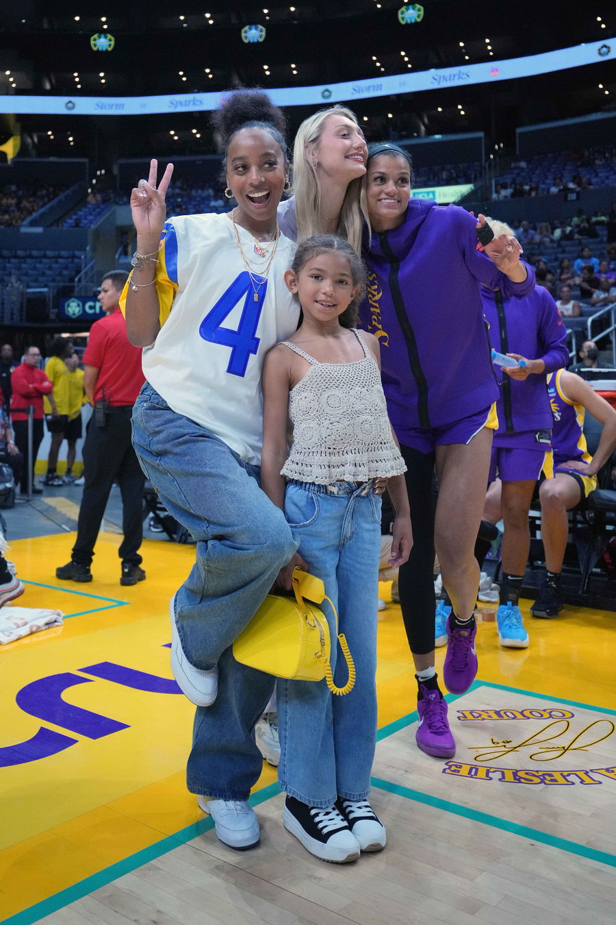 Jul 16, 2024; Los Angeles, California, USA; LA Sparks guard Lexie Brown (left), forward Cameron Brink (center) and guard Rae Burrell pose with Amaya Hamby (the daughter of forward Dearica Hamby, not pictued) during the game against the Seattle Storm at Crypto.com Arena. Mandatory Credit: Kirby Lee-USA TODAY Sports