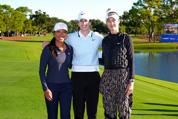 BELLEAIR, FL – NOVEMBER 12: From left to right Lauren Nguyen and Caitlin Clark and Nelly Korda pose for a group photo on the first tee during the Pro Am for The Annika driven by Gainbridge at Pelican on November 12, 2025, at the Pelican Golf Club in Belleair, Florida. Photo by Brian Spurlock/Icon Sportswire GOLF: NOV 12 LPGA, Golf Damen The ANNIKA EDITORIAL USE ONLY Icon25111222