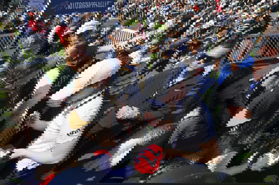 Nov 12, 2025; Belleair, Florida, USA; Indiana Fever guard Caitlin Clark (22) signs autographs for fans after the Annika Pro-Am golf tournament at Pelican Golf Club. Mandatory Credit: Nathan Ray Seebeck-Imagn Images