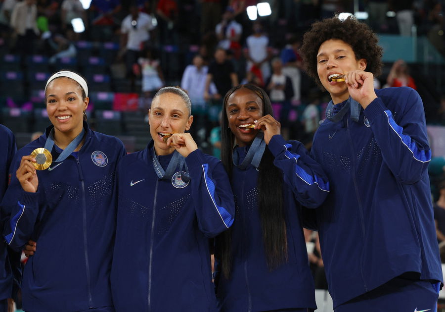 Paris 2024 Olympics – Basketball – Women’s Victory Ceremony – Bercy Arena, Paris, France – August 11, 2024. Gold medallists Napheesa Collier of United States, Diana Taurasi of United States, Jackie Young of United States and Brittney Griner of United States pose for a photo with their medals. REUTERS/Brian Snyder