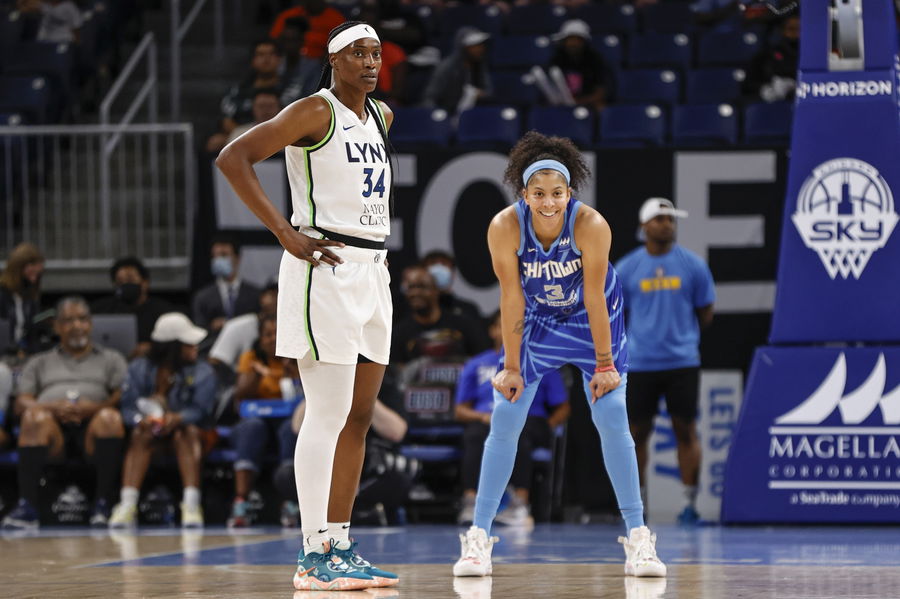 Jun 26, 2022; Chicago, Illinois, USA; Chicago Sky forward Candace Parker (3) stands next to Minnesota Lynx center Sylvia Fowles (34) during the first half at Wintrust Arena. Mandatory Credit: Kamil Krzaczynski-USA TODAY Sports