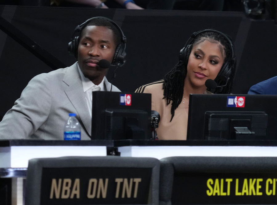 Feb 17, 2023; Salt Lake City, UT, USA; Jamal Crawford and Candace Parker call the game for TNT during the 2023 NBA All Star Rising Stars Game at Vivint Arena. Mandatory Credit: Kyle Terada-USA TODAY Sports