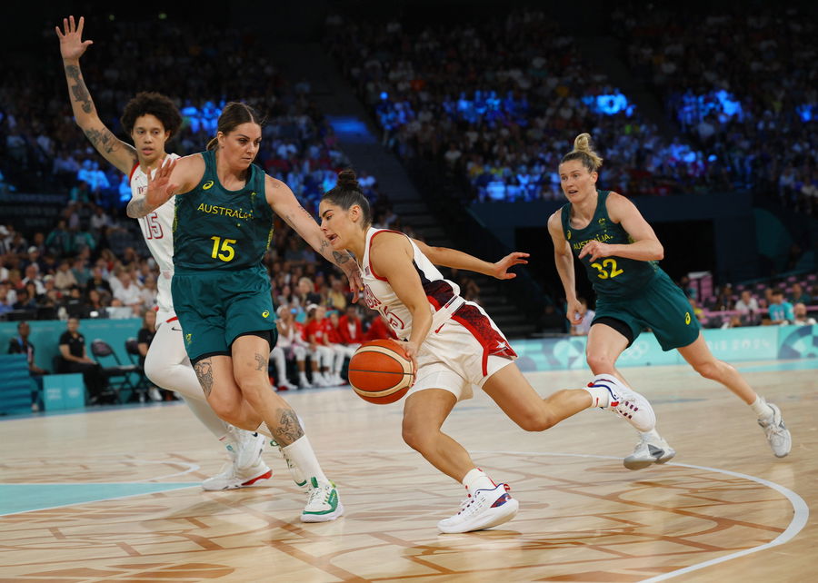 Paris 2024 Olympics – Basketball – Women’s Semifinal – United States vs Australia – Bercy Arena, Paris, France – August 09, 2024. Kelsey Plum of United States in action against Cayla George of Australia. REUTERS/Brian Snyder