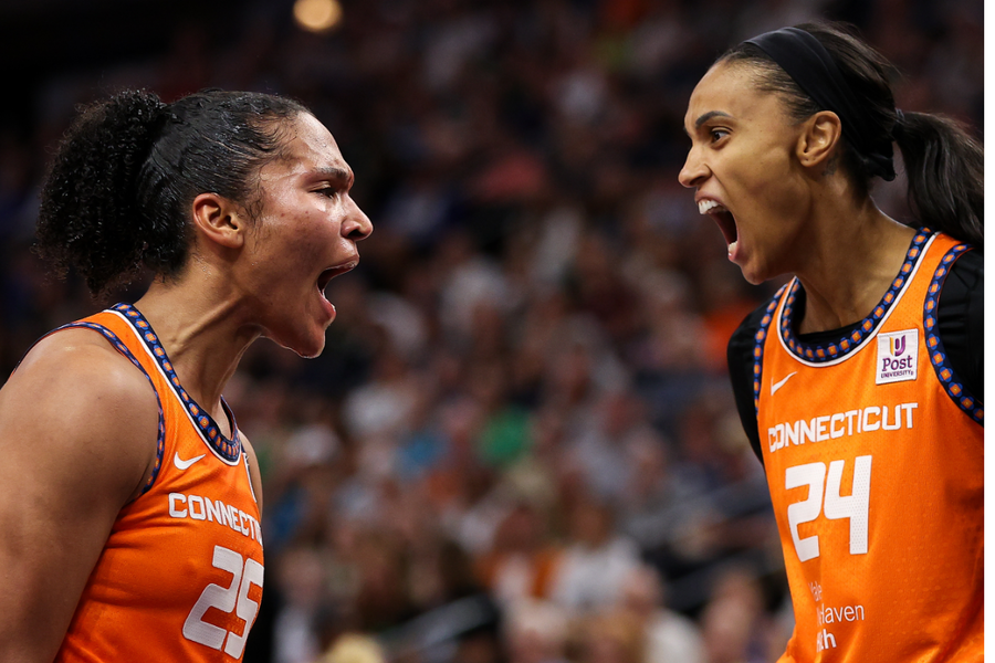 Connecticut Sun forward Alyssa Thomas (25) celebrates her shot with forward DeWanna Bonner (24) during the first half against the Minnesota Lynx of game one of the 2024 WNBA Semi-finals at Target Center. Mandatory Credit: Matt Krohn-Imagn Images
