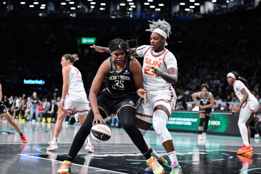 Jun 1, 2025; Brooklyn, New York, USA; New York Liberty center Jonquel Jones (35) posts up as Connecticut Sun center Kariata Diaby (23) defends during the second half at Barclays Center. Mandatory Credit: John Jones-Imagn Images