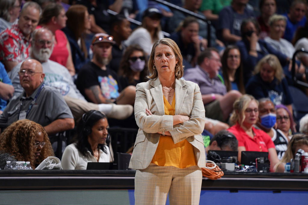 MINNEAPOLIS, MN – JUNE 28: Cheryl Reeve, head coach of the Minnesota Lynx looks on during the game against the Dallas Wings on June 28, 2022 at Target Center in Minneapolis, Minnesota. NOTE TO USER: User expressly acknowledges and agrees that, by downloading and or using this Photograph, user is consenting to the terms and conditions of the Getty Images License Agreement. Mandatory Copyright Notice: Copyright 2022 NBAE (Photo by Jordan Johnson/NBAE via Getty Images)