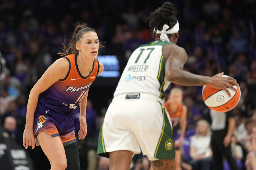 May 17, 2025; Phoenix, Arizona, USA; Phoenix Mercury guard Sevgi Uzun (10) guards Seattle Storm guard Erica Wheeler (17) during the second half at Footprint Center. Mandatory Credit: Joe Camporeale-Imagn Images