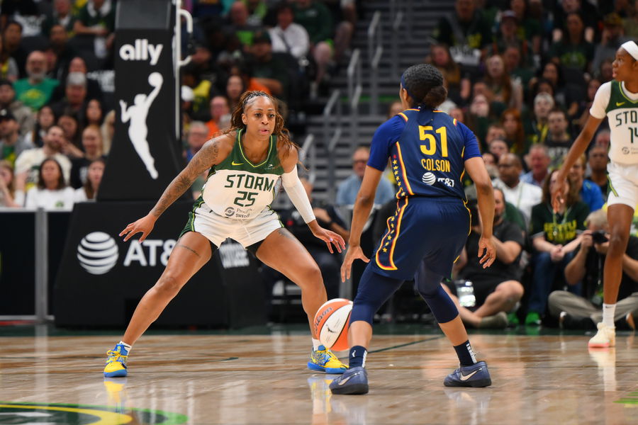 Aug 3, 2025; Seattle, Washington, USA; Seattle Storm guard Tiffany Mitchell (25) guards Indiana Fever guard Sydney Colson (51) during the second half at Climate Pledge Arena. Mandatory Credit: Steven Bisig-Imagn Images