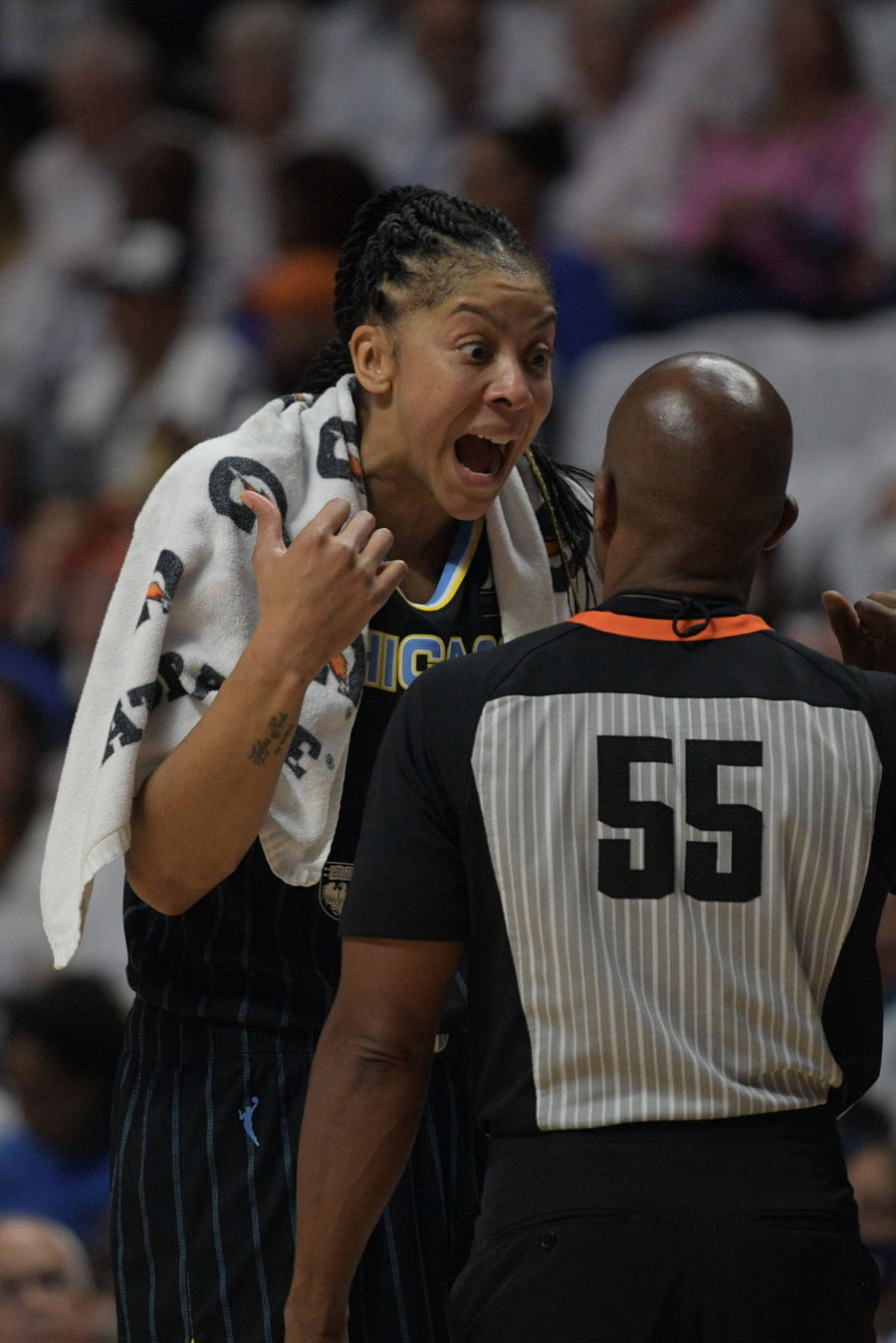 UNCASVILLE, CT – SEPTEMBER 04: Chicago Sky forward Candace Parker 3 engages in a discussion with a referee during Game 3 of the Semifinals of the WNBA, Basketball Damen, USA Playoffs between the Chicago Sky and the Connecticut Sun on September 4, 2022, at Mohegan Sun Arena in Uncasville, CT. Photo by Erica Denhoff/Icon Sportswire WNBA: SEP 04 Playoffs Semifinals Chicago Sky at Connecticut Sun Icon220904018