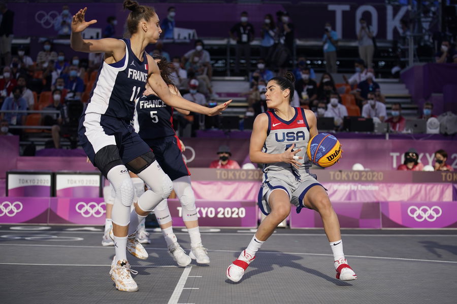 Jul 28, 2021; Tokyo, Japan; USA player Kelsey Plum (5) dribbles while being defended by France player Ana Maria Filip (11) and France player Marie-Eve Paget (5) in the semifinal game during the Tokyo 2020 Olympic Summer Games at Aomi Urban Sports Park. Mandatory Credit: Andrew Nelles-USA TODAY Sports