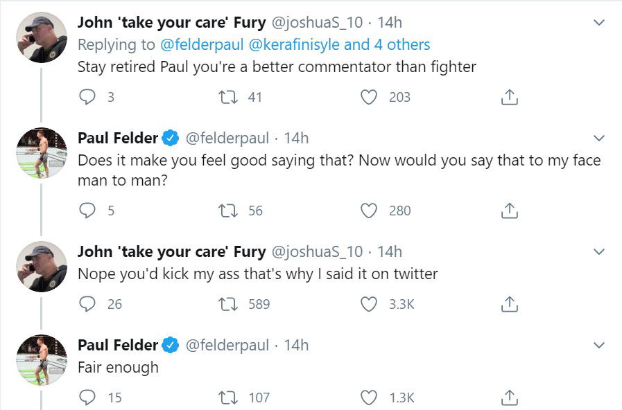 Yet another targeted Felder as he asked the Lightweight to carry on with retirement. However, instead of ignoring the comment, Felder decided to converse with the user.