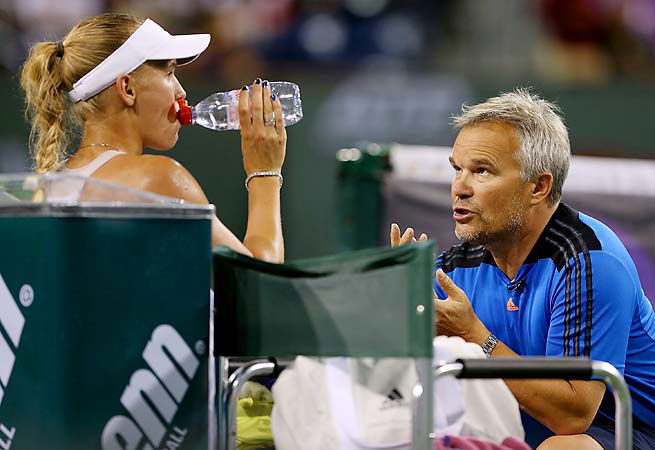 Caroline Wozniacki receives on-court coaching from her father, Piotr, at Indian Wells
