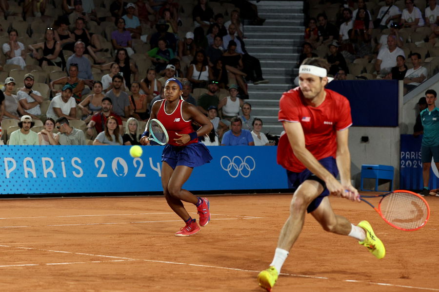 Paris 2024 Olympics – Tennis – Mixed Doubles Quarterfinals – Roland-Garros Stadium, Paris, France – July 31, 2024. Coco Gauff of United States and Taylor Fritz of United States in action during their match against Gabriela Dabrowski of Canada and Felix Auger-Aliassime of Canada. REUTERS/Violeta Santos Moura