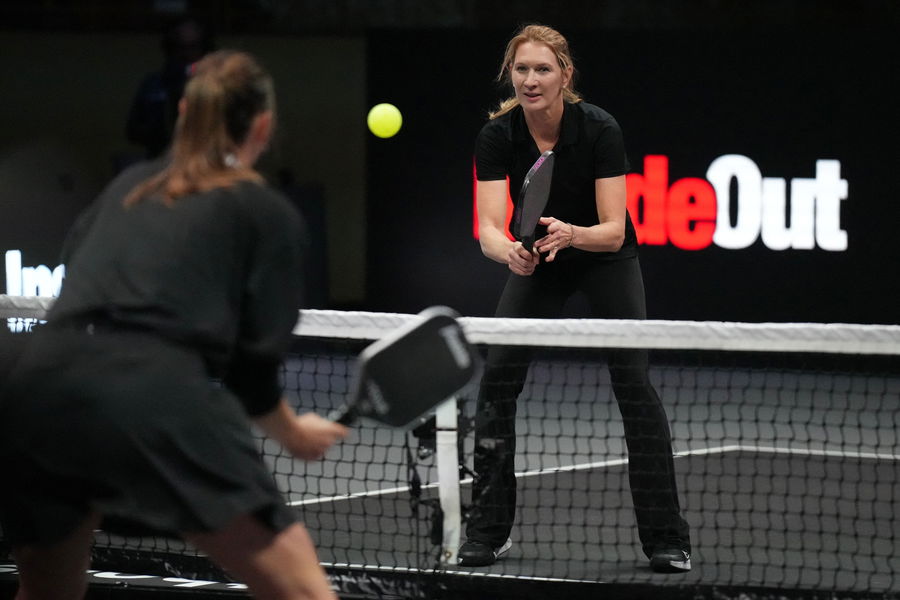 Feb 4, 2024; Hollywood, FL 33314, FL, USA; Steffi Graf returns a volley to Maria Sharapova during Pickleball Slam 2 at Hard Rock Live at Seminole Hard Rock Hotel & Casino. Mandatory Credit: Jim Rassol-USA TODAY Sports