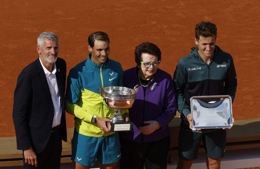 Tennis – French Open – Roland Garros, Paris, France – June 5, 2022 Spain’s Rafael Nadal and Norway’s Casper Ruud pose with trophies after the men’s singles final with former player Billie Jean King REUTERS/Gonzalo Fuentes