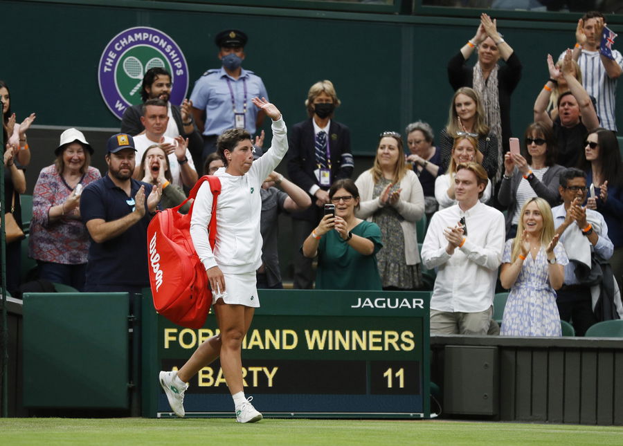 Tennis – Wimbledon – All England Lawn Tennis and Croquet Club, London, Britain – June 29, 2021 Spain’s Carla Suárez Navarro waves to spectators after losing her first round match against Australia’s Ashleigh Barty REUTERS/Peter Nicholls