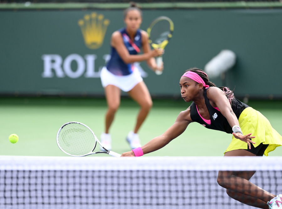 Oct 7, 2021; Indian Wells, CA, USA; Coco Gauff (USA) in yellow/black and Leyla Fernandez (CAN) in white/blue during their first round doubles match in the BNP Paribas Open at the Indian Wells Tennis Garden. Mandatory Credit: Jayne Kamin-Oncea-USA TODAY Sports