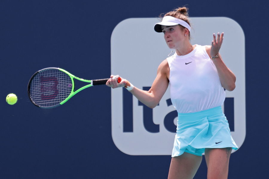 Mar 25, 2021; Miami, Florida, USA; Elina Svitolina of Ukraine hits a forehand against Shelby Rogers of the United States (not pictured) of the Miami Open at Hard Rock Stadium. Mandatory Credit: Geoff Burke-USA TODAY Sports
