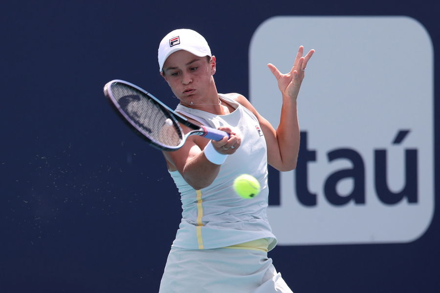Mar 25, 2021; Miami, Florida, USA; Ashleigh Barty of Australia hits a forehand against Kristina Kucova of Slovakia (not pictured) in the second round of the Miami Open at Hard Rock Stadium. Mandatory Credit: Geoff Burke-USA TODAY Sports