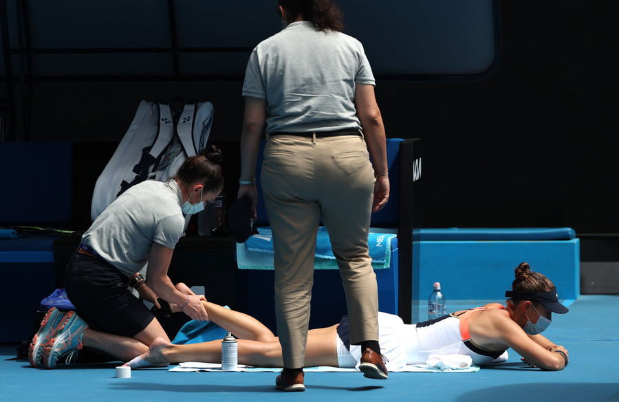 Tennis – Australian Open – Melbourne Park, Melbourne, Australia, February 11, 2021 Switzerland’s Belinda Bencic receives medical attention during her second round match against Russia’s Svetlana Kuznetsova REUTERS/Loren Elliott