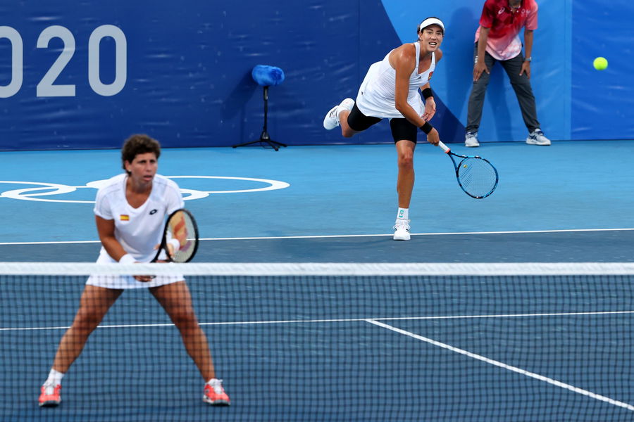 Tokyo 2020 Olympics – Tennis – Women’s Doubles – Round 2 – Ariake Tennis Park – Tokyo, Japan – July 27, 2021. Garbine Muguruza of Spain and Carla Suarez of Spain in action during their second round match against Belinda Bencic of Switzerland and Viktorija Golubic of Switzerland REUTERS/Mike Segar