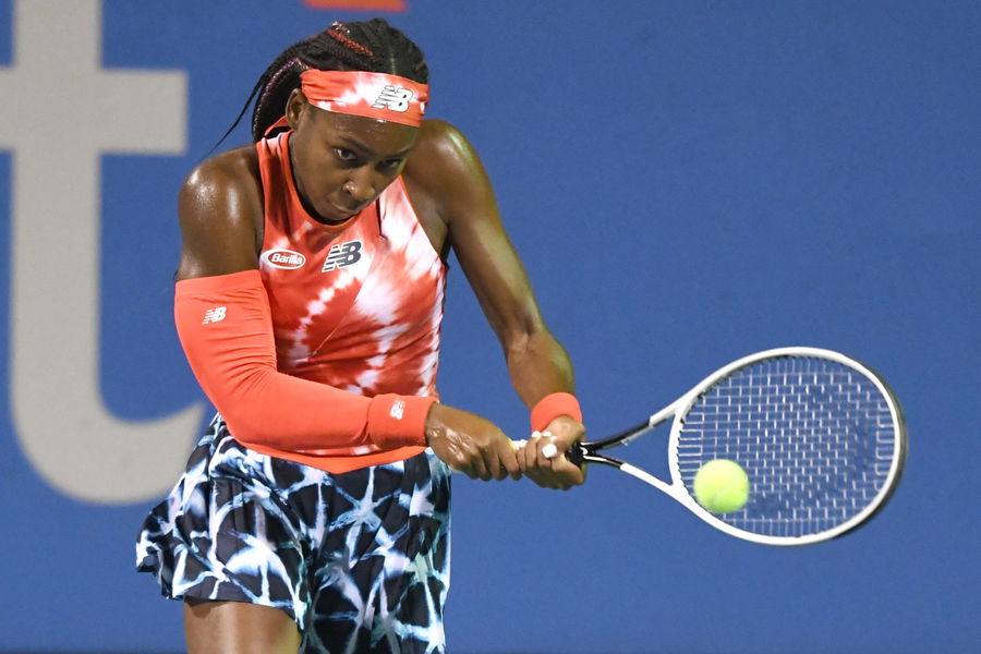 WASHINGTON, DC – AUGUST 05: Cori Gauff of the United States returns a shot during a match against Victoria Azarenka of Belarus on Day 6 during the Womens Invitation of the Citi Open at Rock Creek Tennis Center on August 5, 2021 in Washington, DC. (Photo by Mitchell Layton/Getty Images)