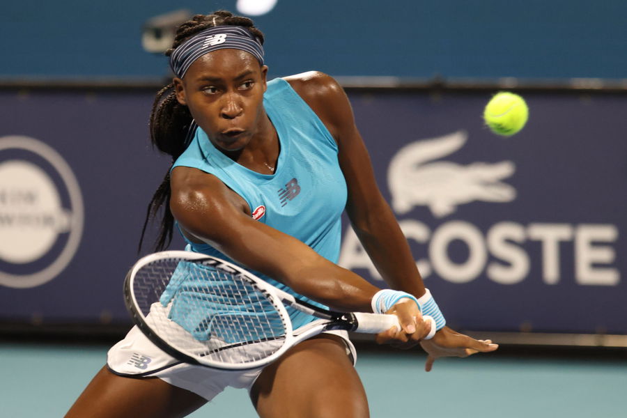 Mar 25, 2021; Miami, Florida, USA; Cori Gauff of the United States hits a forehand against Anastasija Sevastova of Latvia (not pictured) of the Miami Open at Hard Rock Stadium. Mandatory Credit: Geoff Burke-USA TODAY Sports