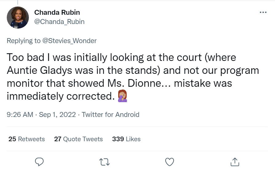 Commentator mistakes Dionne Warwick for Gladys Knight at #USOpen yesterday’s tennis match between Serena Williams & Anett Kontaveit