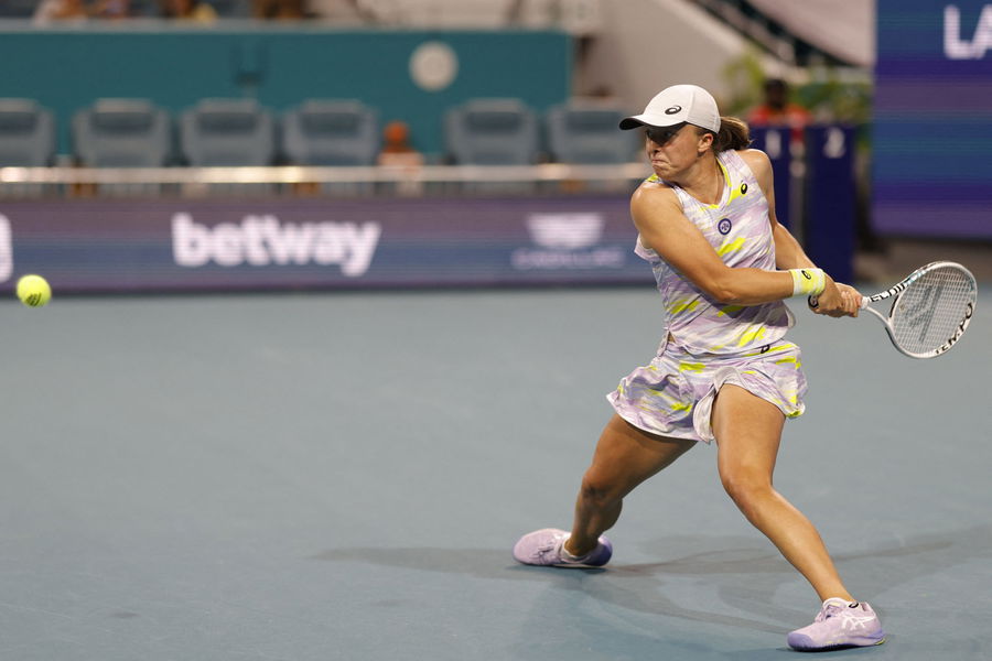 Mar 30, 2022; Miami Gardens, FL, USA; Iga Swiatek (POL) hits a backhand against Petra Kvitova (CZE)(not pictured) in a women’s singles quarterfinal match in the Miami Open at Hard Rock Stadium. Mandatory Credit: Geoff Burke-USA TODAY Sports