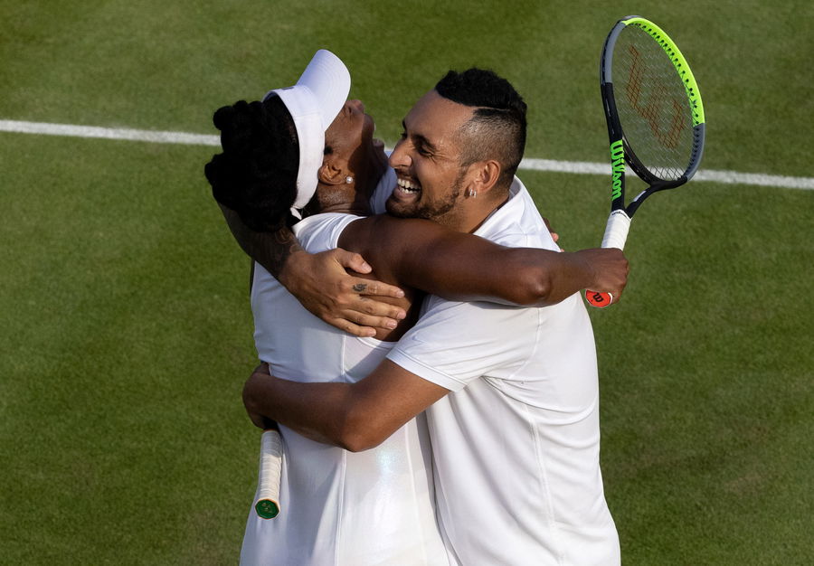 LONDON, ENGLAND – JULY 02: Nick Kyrgios of Australia and Venus Williams of USA celebrate winning against Sabrina Santamaria and Austin Krajicek both of USA during their mixed doubles first round match on Day Five of The Championships – Wimbledon 2021 at All England Lawn Tennis and Croquet Club on July 02, 2021 in London, England. (Photo by AELTC/Ian Walton – Pool/Getty Images)