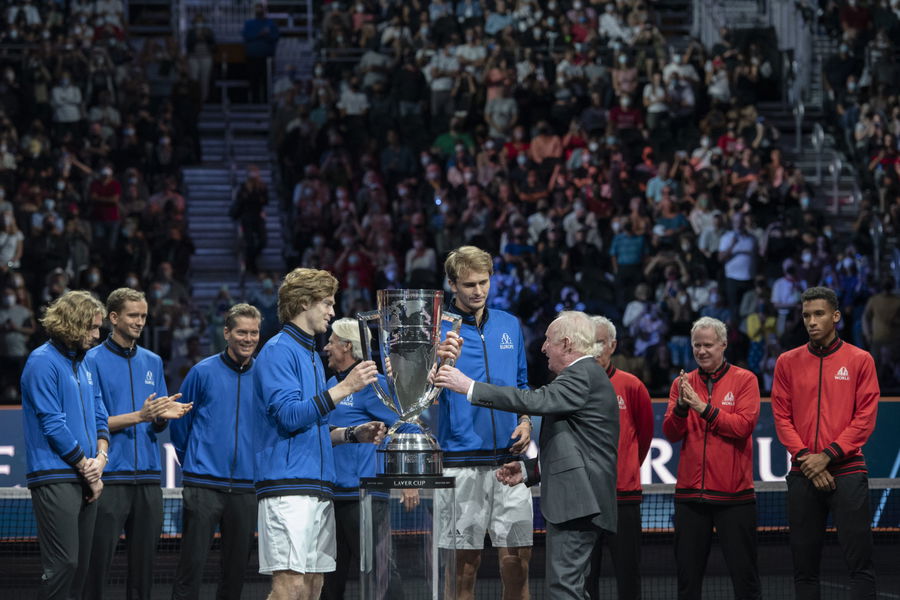 Sep 26, 2021; Boston, MA, USA; Rod Laver presenting the Cup to Alexander Zverev and Andrey Rublev. Team Europe beat Team World 14-1 at TD Garden. Mandatory Credit: Richard Cashin-USA TODAY Sports