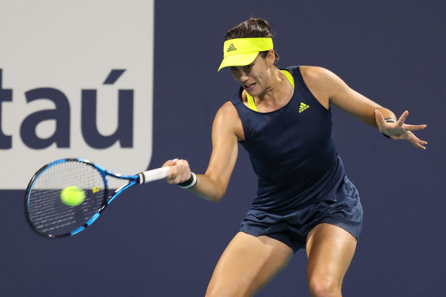 Mar 29, 2021; Miami, Florida, USA; Garbie Muguruza of Spain hits a forehand against Bianca Andreescu of Canada (not pictured) in the fourth round in the Miami Open at Hard Rock Stadium. Mandatory Credit: Geoff Burke-USA TODAY Sports