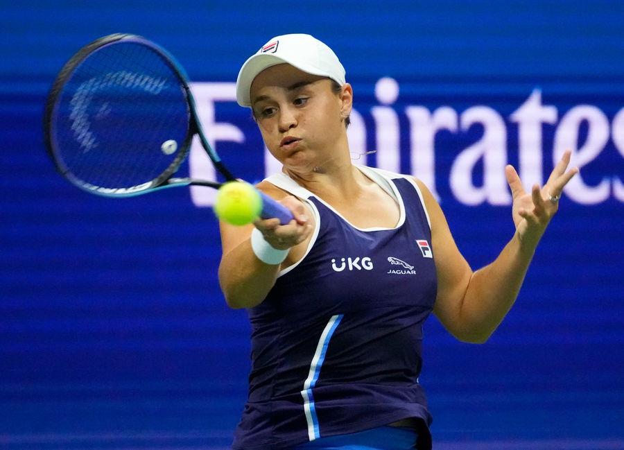 Sep 4, 2021; Flushing, NY, USA; Ashleigh Barty of Australia hits to Shelby Rogers of the USA on day six of the 2021 U.S. Open tennis tournament at USTA Billie Jean King National Tennis Center. Mandatory Credit: Robert Deutsch-USA TODAY Sports