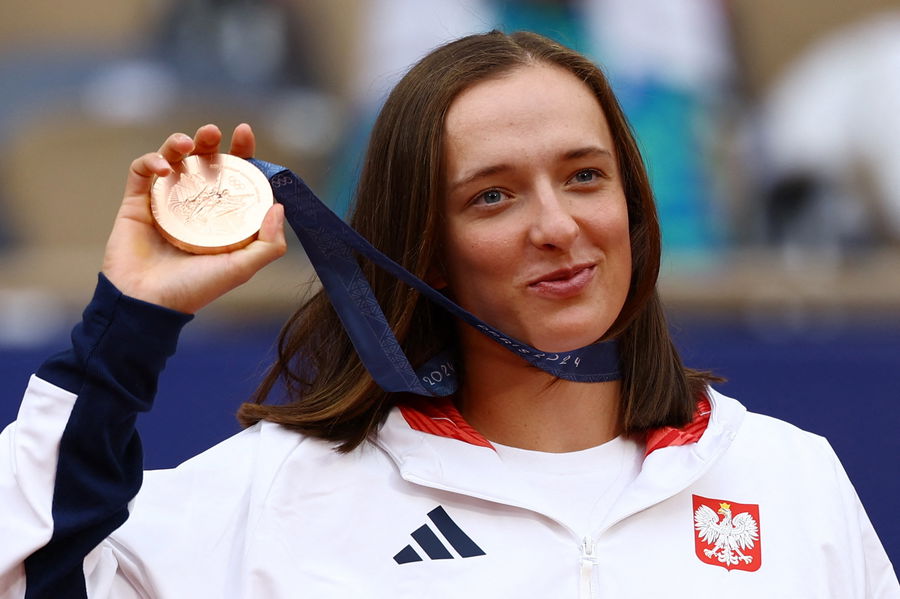 Paris 2024 Olympics – Tennis – Women’s Singles Victory Ceremony – Roland-Garros Stadium, Paris, France – August 03, 2024. Bronze medallist Iga Swiatek of Poland poses with her medal. REUTERS/Edgar Su