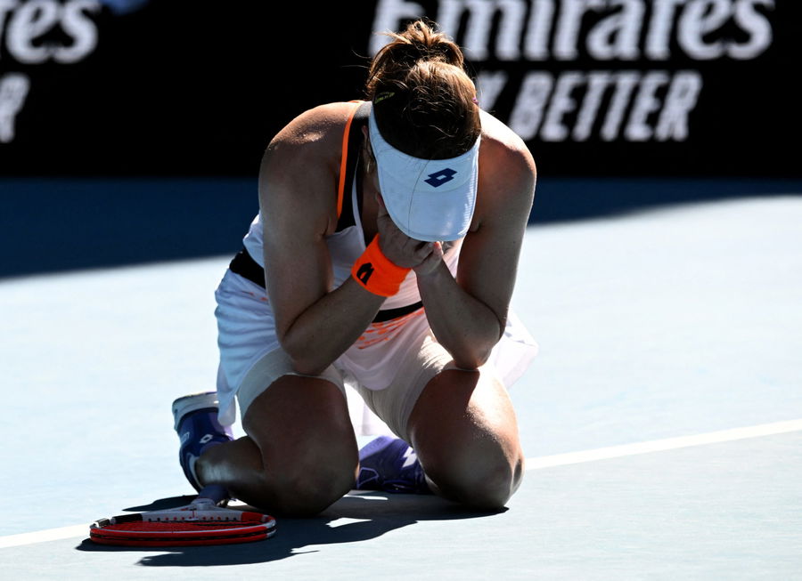 Tennis – Australian Open – Melbourne Park, Melbourne, Australia – January 24, 2022 France’s Alize Cornet celebrates winning her fourth round match against Romania’s Simona Halep REUTERS/Morgan Sette
