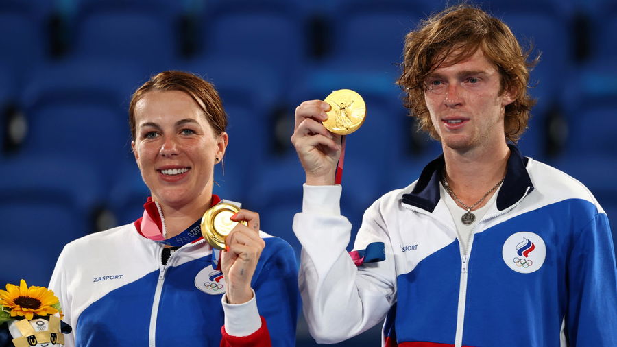 Tokyo 2020 Olympics – Tennis – Mixed Doubles – Medal Ceremony – Ariake Tennis Park – Tokyo, Japan – August 1, 2021. Gold medallists Anastasia Pavlyuchenkova and Andrey Rublev of the Russian Olympic Committee on the podium REUTERS/Stoyan Nenov
