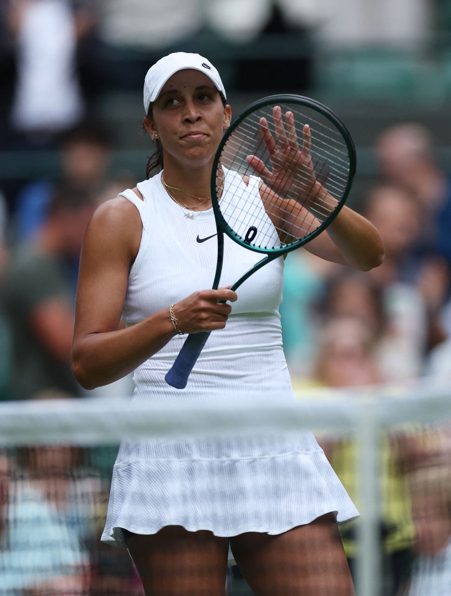 Tennis – Wimbledon – All England Lawn Tennis and Croquet Club, London, Britain – July 1, 2024 Madison Keys of the U.S. celebrates winning her first round match against Italy’s Martina Trevisan REUTERS/Isabel Infantes