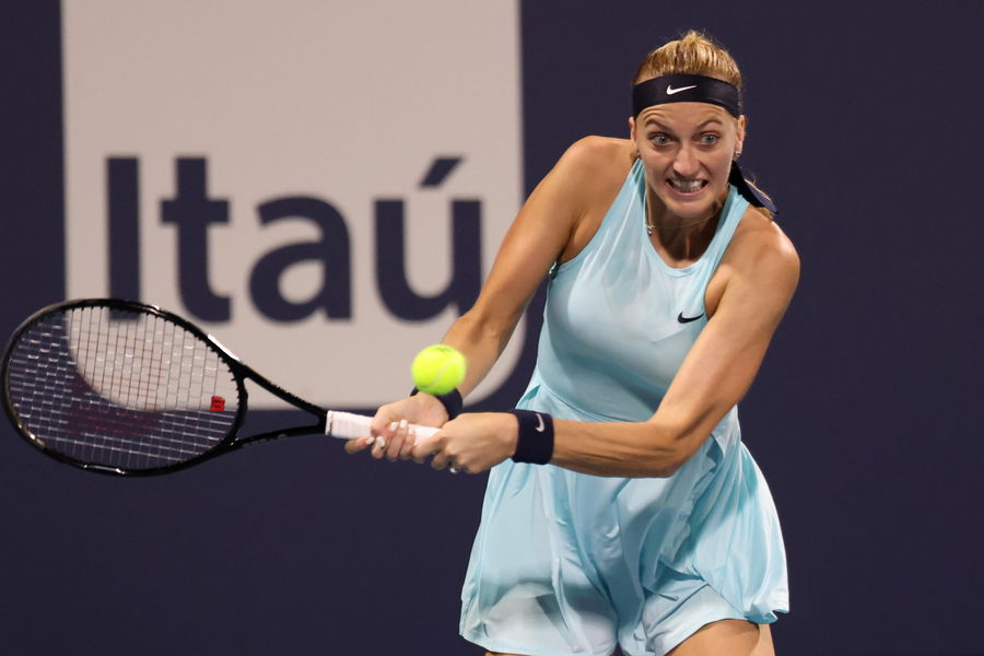 Mar 27, 2021; Miami, Florida, USA; Petra Kvitova of Czech Republic hits a backhand against Johanna Konta of Great Britain (not pictured) in the third round in the Miami Open at Hard Rock Stadium. Mandatory Credit: Geoff Burke-USA TODAY Sports