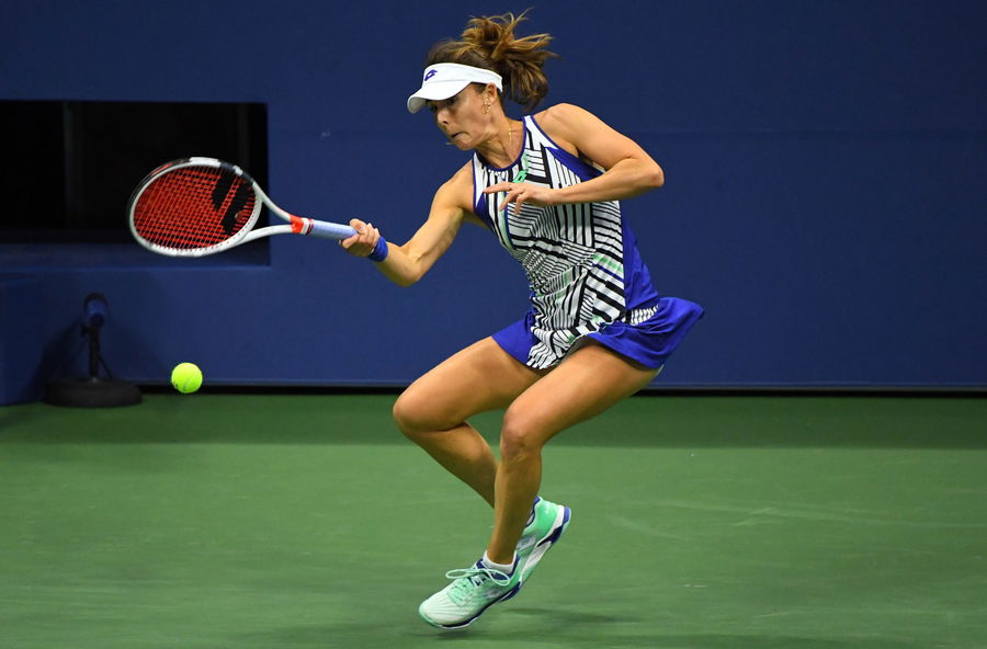 Flushing Meadows, New York, USA; Alize Cornet of France hits the ball against Madison Keys of the United States on day six of the 2020 U.S. Open tennis tournament at USTA Billie Jean King National Tennis Center. Mandatory Credit: Robert Deutsch-USA TODAY Sports