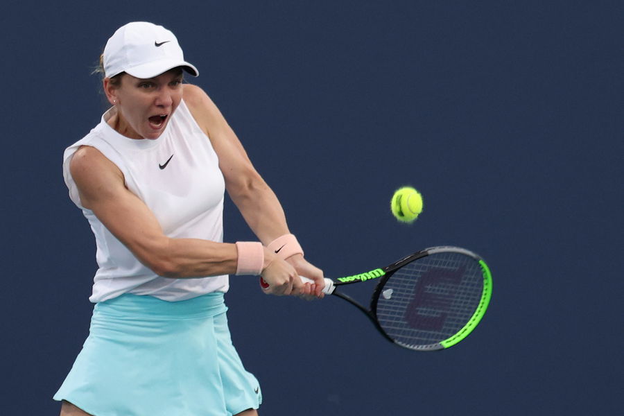 Mar 25, 2021; Miami, Florida, USA; Simona Halep of Romania hits a backhand against Caroline Garcia of France (not pictured) in the second round of the Miami Open at Hard Rock Stadium. Mandatory Credit: Geoff Burke-USA TODAY Sports