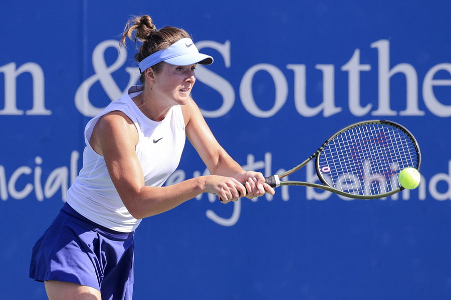 Aug 18, 2021; Mason, OH, USA; Elina Svitolina (UKR) returns a shot against Angelique Kerber (GER) during the Western and Southern Open tennis tournament at Lindner Family Tennis Center. Mandatory Credit: Aaron Doster-USA TODAY Sports