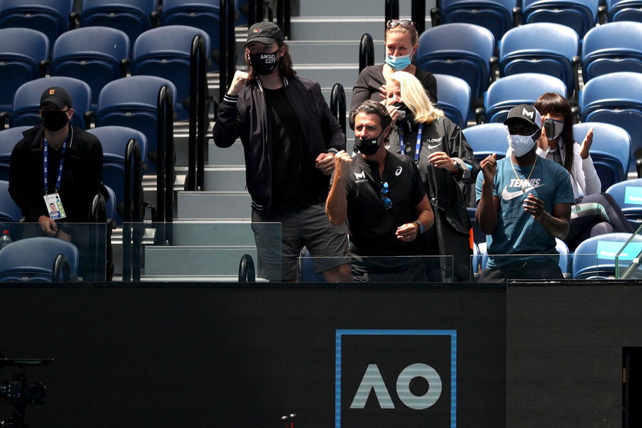 Tennis – Australian Open – Melbourne Park, Melbourne, Australia, February 14, 2021. The husband of Serena Williams, Alexis Ohanian and her coach Patrick Mouratoglou react during her fourth round match against Belarus’ Aryna Sabalenka. REUTERS/Loren Elliott