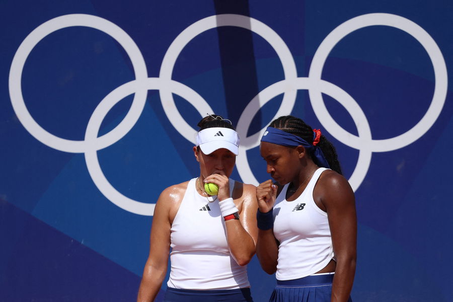 Paris 2024 Olympics – Tennis – Women’s Doubles Second Round – Roland-Garros Stadium, Paris, France – July 31, 2024. Coco Gauff of United States and Jessica Pegula of United States react during their match against Karolina Muchova of Czech Republic and Linda Noskova of Czech Republic. REUTERS/Phil Noble