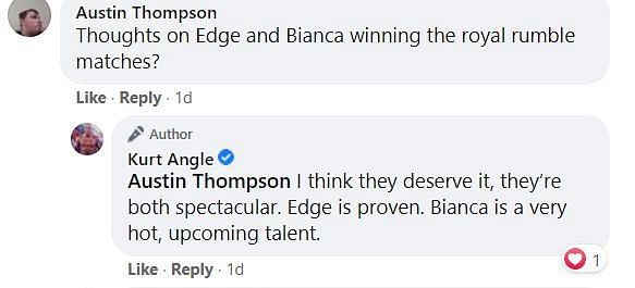 Coming back to Angle, he also answered another question from the fans regarding WWE. One fan asked him about this year’s Rumble winners, Edge and Bianca Belair.