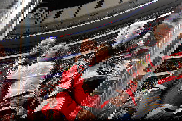 CHICAGO, IL – FEBRUARY 13: MMA fighter and former WWE champion, CM Punk, and wife WWE wrestler AJ Lee, celebrate after the Chicago Blackhawks scored against the New Jersey Devils in the third period during the NHL game at the United Center on February 13, 2015 in Chicago, Illinois. (Photo by Bill Smith/NHLI via Getty Images)