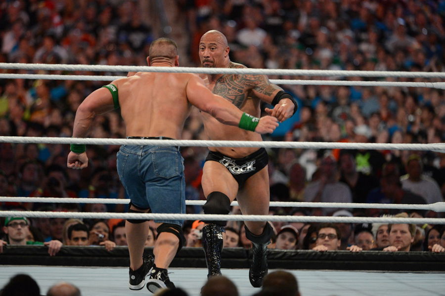 MIAMI GARDENS, FL – APRIL 1: Dwayne ”The Rock” Johnson and John Cena in action during WrestleMania XXVIII at Sun Life Stadium on April 1, 2012 in Miami Gardens, Florida. (Photo by Ron Elkman/Sports Imagery/Getty Images)