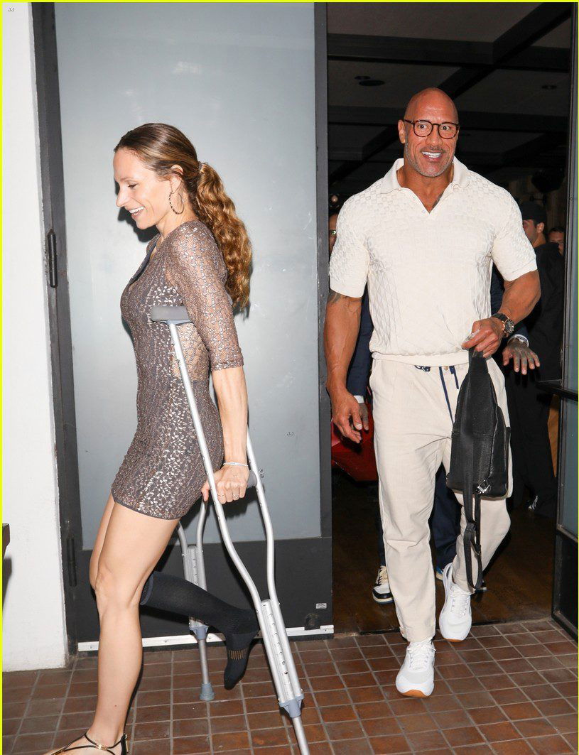Dwayne Johnson wore a cream top, and cream trousers that showed off his impressive physique, while Hashian wore a sparkly dress and black sandals. Hashian’s injured leg would also be wrapped in a black cast.