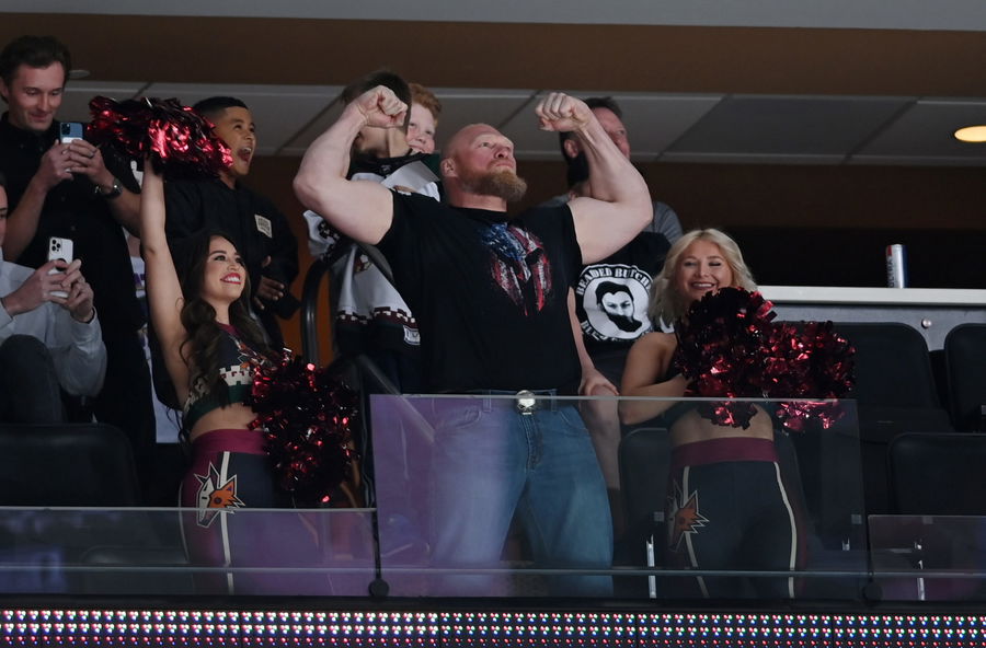 GLENDALE, ARIZONA – APRIL 22: Brock Lesnar, former WWE champion and UFC champion, flexes for the crowd during a game between the Arizona Coyotes and Washington Capitals at Gila River Arena on April 22, 2022 in Glendale, Arizona. (Photo by Norm Hall/NHLI via Getty Images)