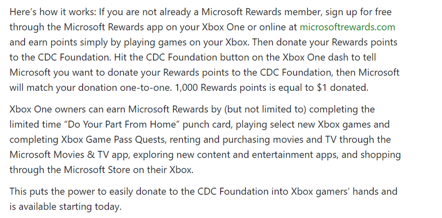 “Starting today, Xbox One owners in the U.S. will see on the home screen of their Xbox One. A button to benefit coronavirus response efforts by easily donating to the CDC Foundation.”